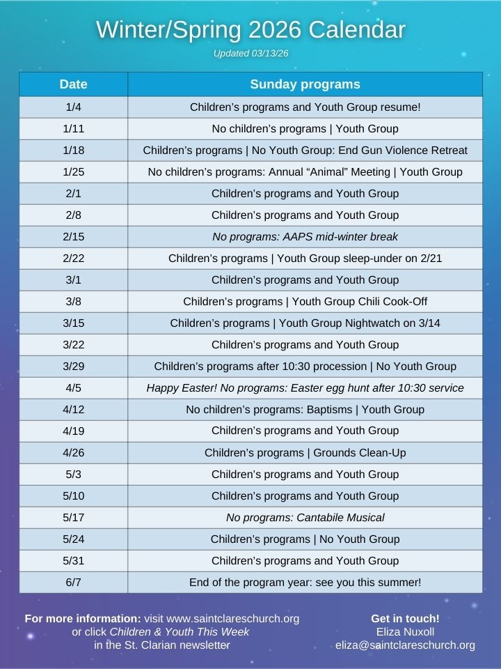 For questions or more information, or to sign up for our weekly Children & Youth newsletter, please email Eliza: eliza@saintclareschurch.org.